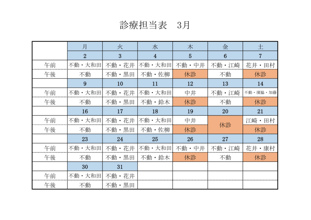 3月の診療体制について、以下の通り一部変更がございます。受診の際はご注意ください。