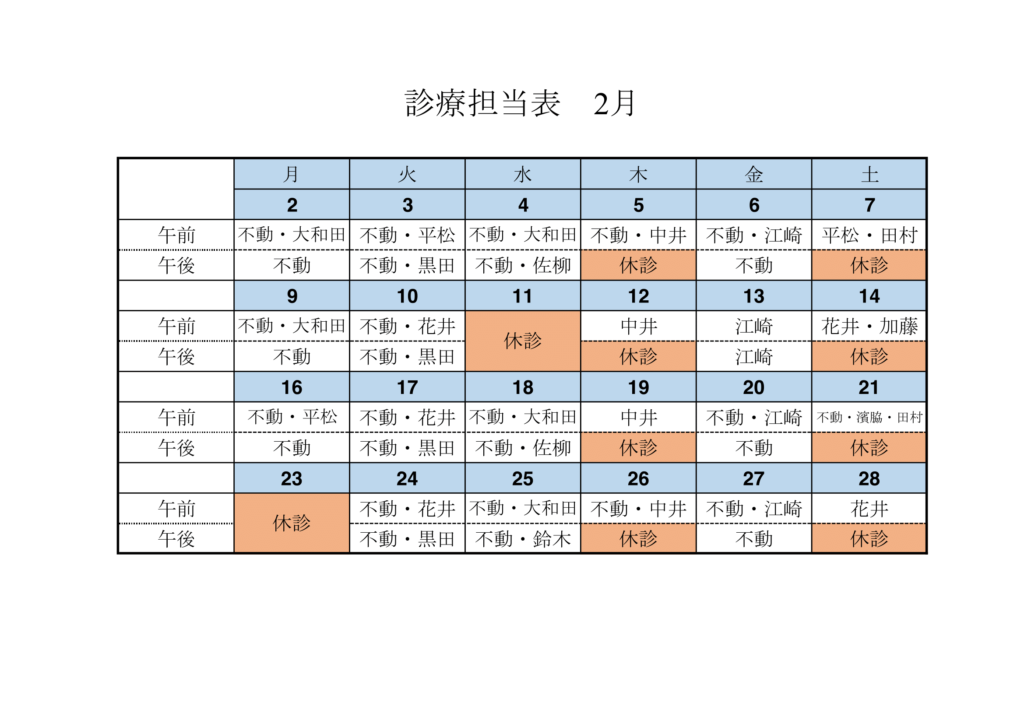 2月の診療体制について、以下の通り一部変更がございます。受診の際はご注意ください。